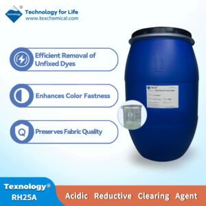 Texnology®RH25A is a high-efficiency liquid reduction clearing agent designed to remove unfixed disperse dyes from polyester, acrylic, and acetate fibers, and their blends under acidic conditions.