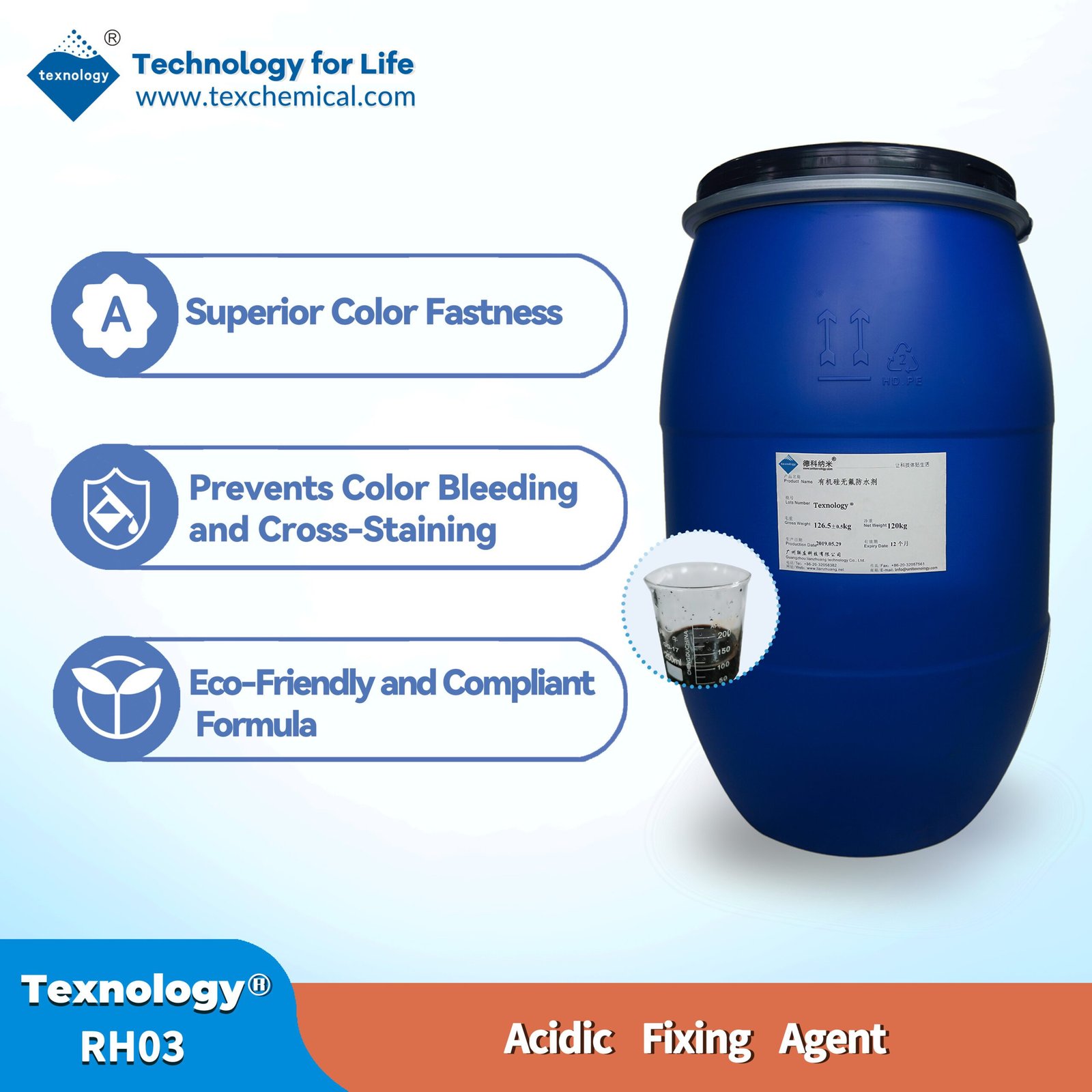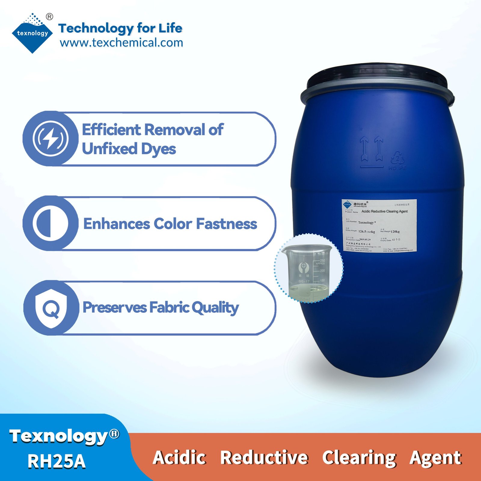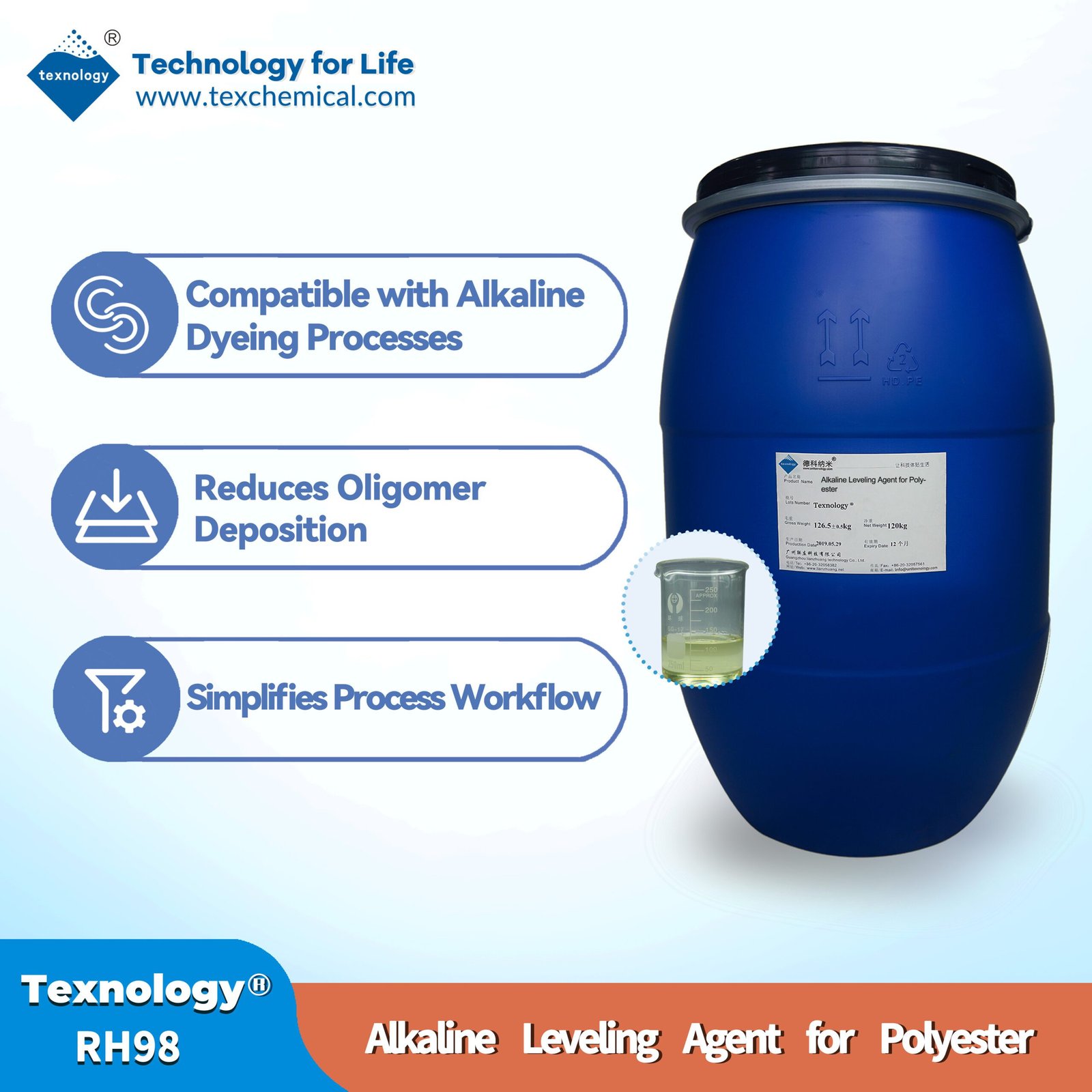 Texnology®RH98 is a polyester dyeing agent, which is specialty auxiliary for alkaline dyeing of polyester and its blended fabrics. It reduces overall dyeing costs while eliminating common defects (e.g., dye spots, specks, unevenness) caused by oligomer contamination in traditional acid dyeing. Fabrics dyed with this alkaline system exhibit purer color tones, softer handfeel, and better environmental compliance compared to conventional acid dyeing.